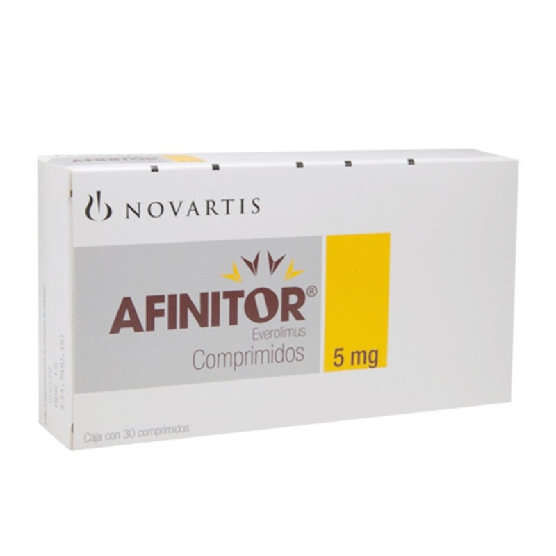 Afinitor 5 mg se presenta en una caja con 30 comprimidos diseñados para facilitar la adherencia al tratamiento. Como otros medicamentos oncológicos, puede generar efectos secundarios como estomatitis, cansancio, infecciones o alteraciones metabólicas. Es fundamental seguir las indicaciones médicas y no modificar la dosis sin supervisión profesional.